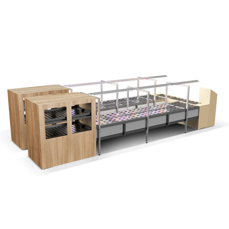 Linee di Fertirrigazione e Accrescimento: Il sistema è progettato per ospitare due linee di vasche dedicate alla fertirrigazione e all'accrescimento delle piante, garantendo un ambiente di crescita ottimizzato.