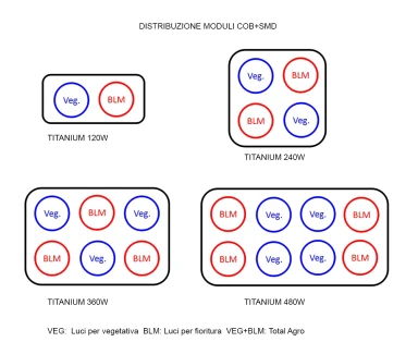 Die Lampen der Serie TTS werden mit Modulen hergestellt, die aus 1 AGROCOB + 6 SMD-LEDs bestehen. Diese Module werden nur mit EPILED® Cob, smd CREE® und UL® Treibern hergestellt.