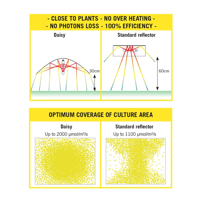 Das von der Lampe ausgestrahlte Licht bestrahlt die Pflanzen nicht direkt, sondern indirekt, da es von dem großen Reflektor des Schirms reflektiert wird.