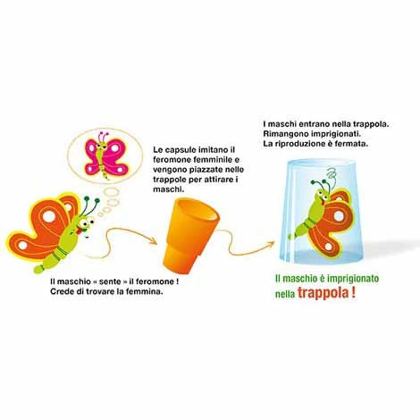 Estos son atraídos y quedan atrapados y eliminados. Esto impide el apareamiento, la reproducción y, por tanto, la puesta de huevos.