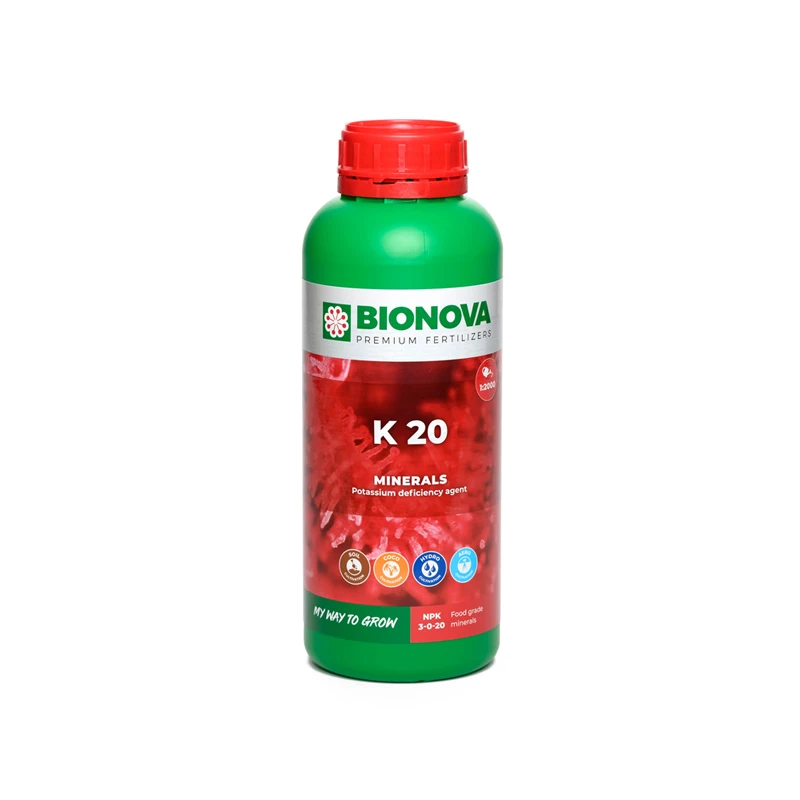 - Utilisez Bionova K 20 en tant que mono-élément pour préparer un programme de nutrition sur mesure, vous pouvez décider exactement de la quantité de potassium à donner à votre culture.