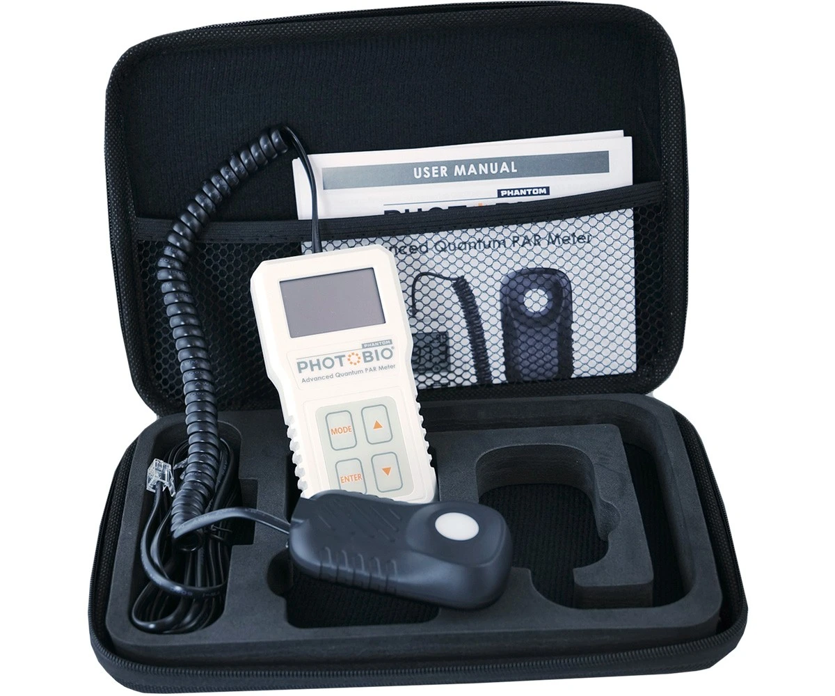 Il misuratore PAR Advanced Quantum PHOTOBIO fornisce misurazioni accurate e convenienti per qualsiasi sorgente luminosa utilizzata in applicazioni orticole. È progettato per misurare il flusso PAR (radiazione fotosinteticamente attiva) a lunghezze d'onda comprese tra 400 e 700 nm. Esiste una relazione proporzionale positiva tra il numero di fotoni assorbiti nella banda da 400 a 700 nm e la velocità della fotosintesi, importante per massimizzare la resa delle colture.