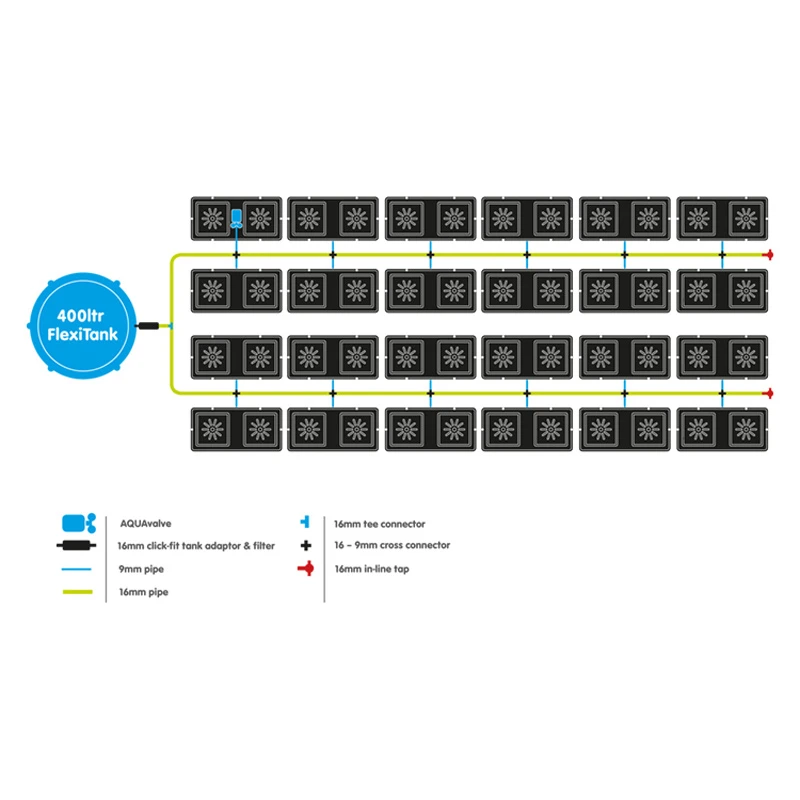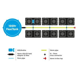 - Stellen Sie Ihren Tank mindestens 150 mm über das höchste AQUAvalve und füllen Sie den Tank, wenn etwa 1/3 der Lösung übrig ist. So bleiben die Ventile effektiv in Betrieb.