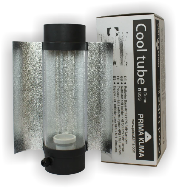 Zylindrischer Pyrex-Glasreflektor zur Kühlung der von der Lampe erzeugten Wärme. Die Cooltube ist über ein Alufex-Rohr mit einem Aspirator mit demselben Durchmesser verbunden. Durch den Luftstrom wird ein großer Teil der von der Lampe erzeugten Wärme abgeleitet und das Licht so nah wie möglich an die apikalen Teile gebracht, wodurch die Lichtintensität auf den Pflanzen erhöht wird.