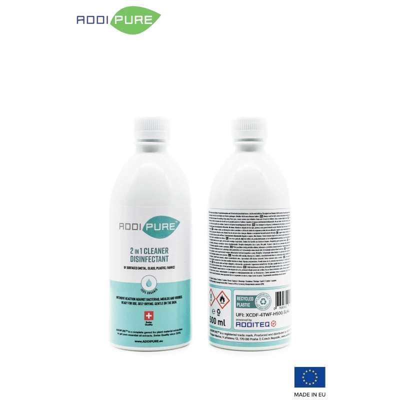 ADDIPURE 2en1 Limpiador Desinfectante es un limpiador y desinfectante orgánico a base de alcohol. Adecuado para el hogar, el comercio y la industria (por ejemplo, la industria alimentaria). El producto está listo para usar y puede aplicarse directamente. No requiere dilución ni aclarado. Se seca solo.