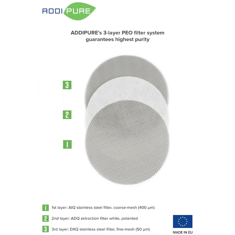 Le tout nouveau système de filtration ADDIPURE à 3 couches offre la plus grande pureté : le filtre d'extraction blanc breveté de l'ADQ est pris en sandwich entre 2 filtres en acier inoxydable : une première maille large (400µ) et une seconde maille plus fine (50µ).