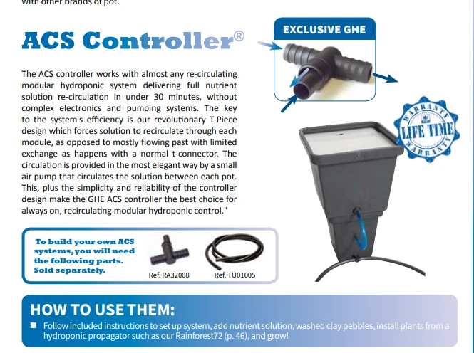 - Il est possible d'adapter le contrôleur 'ACS' à tous les types de systèmes, qu'ils soient de GHE, d'autres fabricants ou de fabrication personnelle. Des tuyaux et des connecteurs sont disponibles si vous souhaitez étendre vos installations.