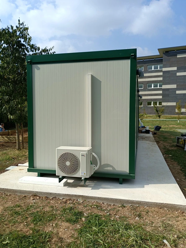 Préfabriqué pour l'extérieur 1200x240x270hcm complet avec base, parois en panneaux sandwich, portes et fenêtres en aluminium/PVC blanc, système électrique et climatisation.