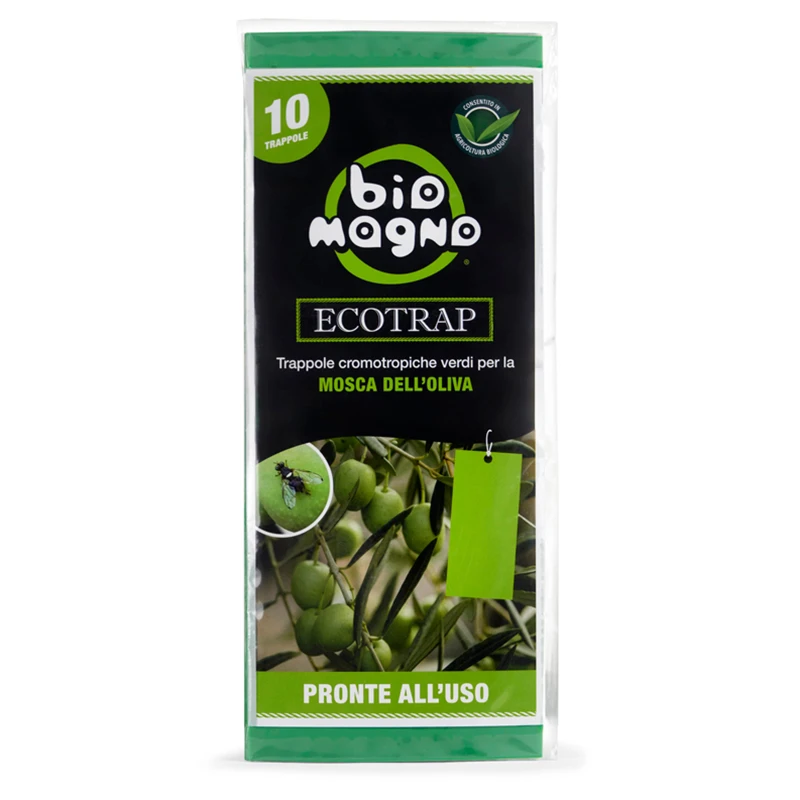 Ecotrap von Biomagno ist eine gebrauchsfertige chromotrope Falle aus wasser- und wetterfestem Kunststoff, die beidseitig mit Klebstoff beschichtet ist und deren Funktionsprinzip auf der Anziehungskraft der Farbe Grün auf die Olivenfliege beruht. Die Fallen enthalten keine Insektizide, so dass eine wirksame und 100% natürliche Bekämpfung möglich ist. Ideal für Obstbäume, Gemüsegärten und Gärten.