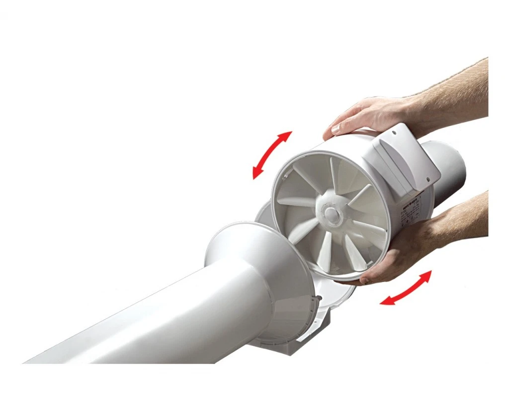 Das abnehmbare Laufrad und der Motorblock mit Klemmenkasten werden mit Hilfe spezieller Klemmen mit Sperrklinken am Gehäuse befestigt, das mit den Zapfen zusammengebaut ist. Dies ermöglicht eine schnelle und einfache Wartung des Ventilators. Die Wartung des Ventilators erfordert keine vollständige Demontage. Es genügt, den zentralen Block aus dem Gehäuse zu entfernen und die erforderliche Wartung durchzuführen.