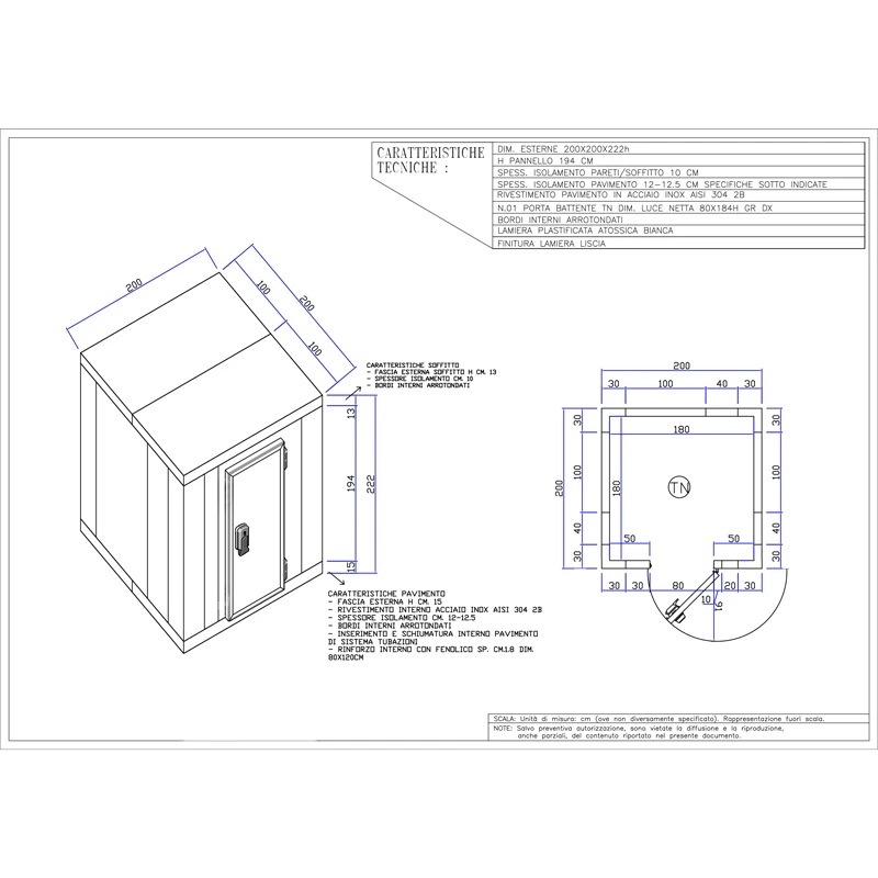 - Espesor del aislamiento del suelo cm. 15 con bordes internos redondeados; Revestimiento de acero inoxidable AISI 304 SB