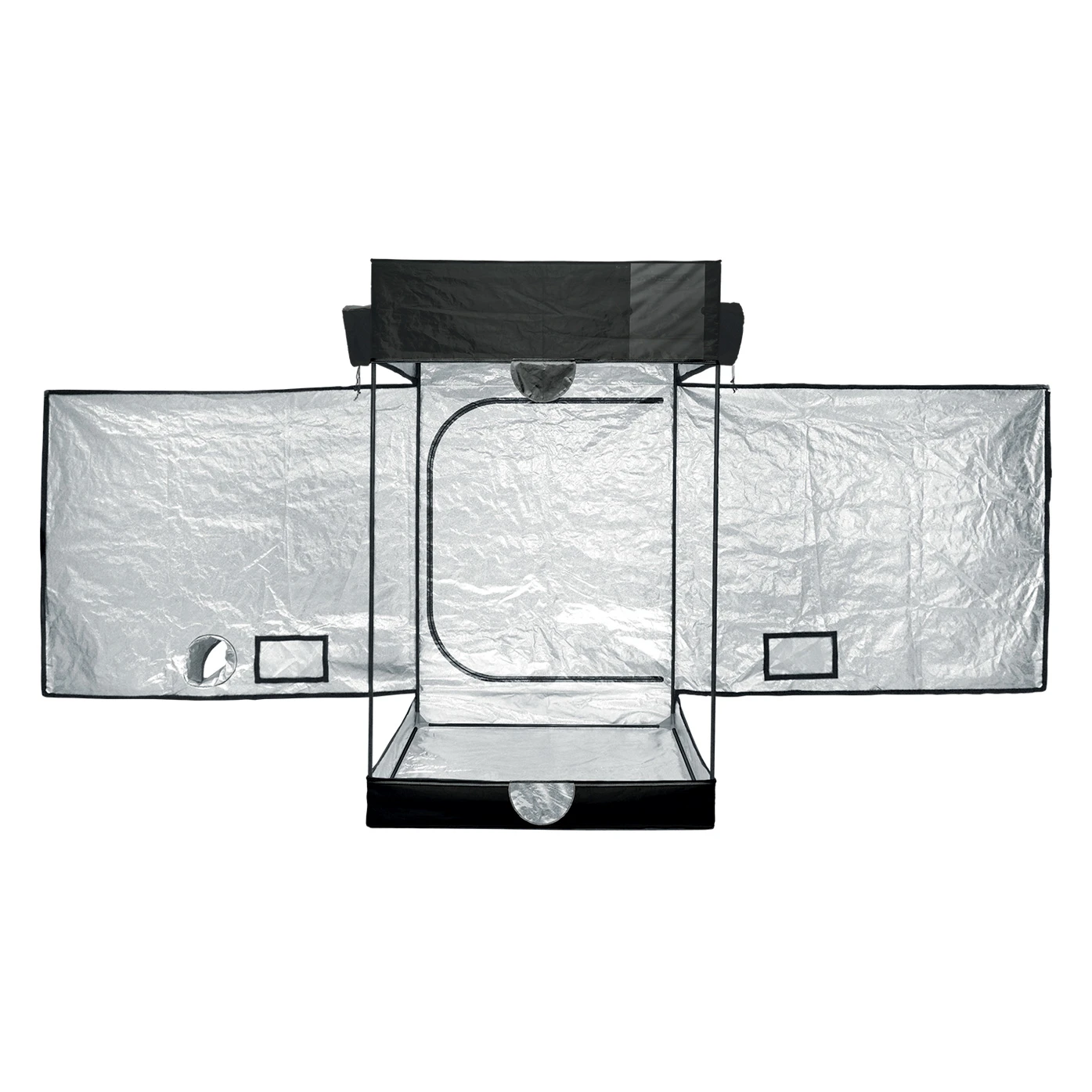L'armoire est équipée d'un tissu de haute qualité et hautement réfléchissant, ainsi que de bandes Velcro pour maintenir les portes ouvertes, de bandes pour supporter le poids du filtre à charbon et de charnières de première qualité.