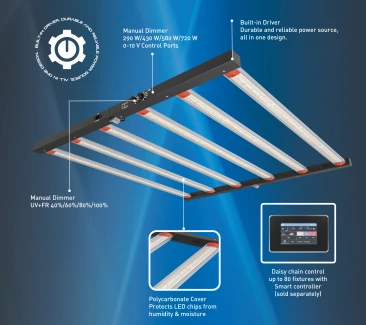 Le pilote interne, le gradateur manuel et la connexion pour un contrôle externe 0-10V, ainsi qu'un système d'assemblage rapide et intuitif sont les caractéristiques qui font de cette ligne un produit très populaire, même pour ceux qui débutent dans ce hobby sans compétences particulières.
