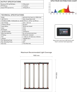Caractéristiques principales Ortoled S Line HL780w avec double spectre (Blanc + Rouge foncé 720W) + UV/FR 60W 2,7 µmol/J :