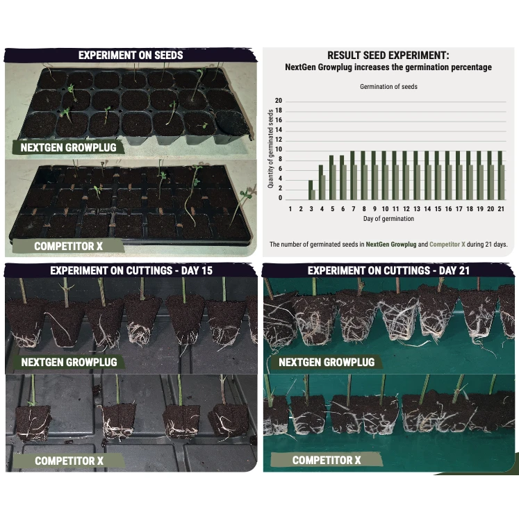 Après un enracinement visible, la motte doit être transplantée dans un milieu de culture. Les bouchons de culture NextGen sont conçus pour rester intacts pendant la transplantation, ce qui facilite la manipulation et garantit que les racines de la plante ne sont pas endommagées.