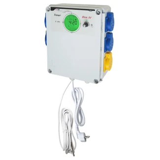 L'orologio ha un ciclo di 12 o 18 ore preprogrammato, è possibile impostare un orario definito dall'utente ore/minuti. L'orologio dispone di un contagiorni e di una sonda di temperatura per un arresto di emergenza in caso di surriscaldamento a protezione delle vostre piante. Il LED di alimentazione indicherà un arresto di emergenza dopo il tuo successivo ritorno. Oltre alla funzione on-off specifica per carichi induttivi, il Timer Box 4 dispone di un'uscita 0-10V o PWM per ballast elettronici dimmerabili o lampade a LED. Questo segnale attenua le luci quando la temperatura aumenta o sono possibili funzioni come alba/tramonto. Quando le lampade sono spente, viene attivata una presa di riscaldamento.