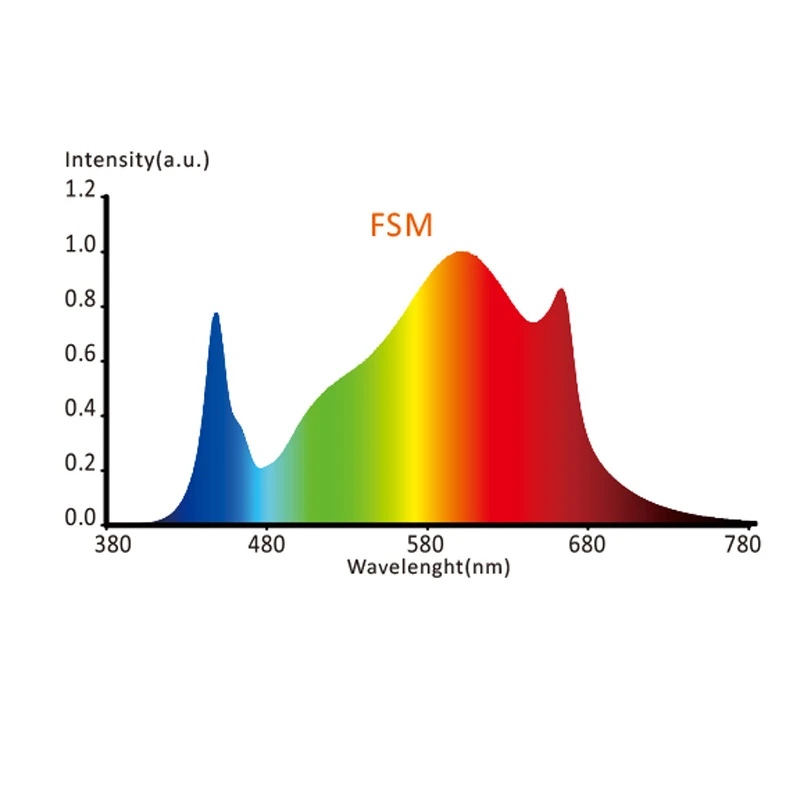 La temperatura di colore complessiva dell'intero spettro di FSM è controllata a 3000-3300 K, che aumenta l'energia radiante della luce rossa a una lunghezza d'onda di 660 nm in luce bianca.