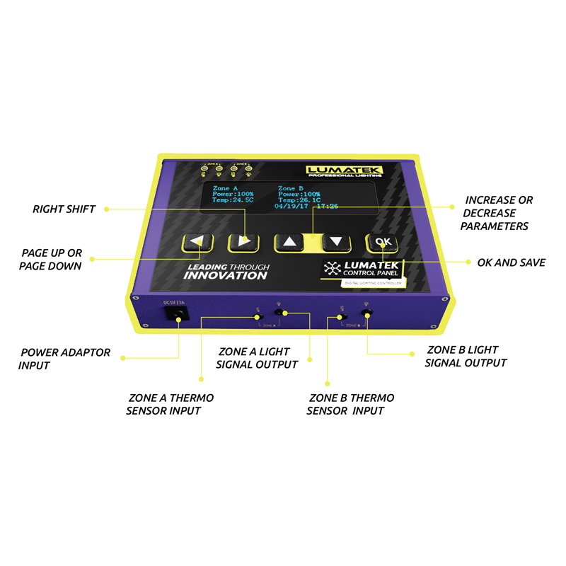 El Panel de Control Lumatek es un controlador de iluminación digital que ofrece un control excepcional sobre sus kits de iluminación de la serie Lumatek Control.