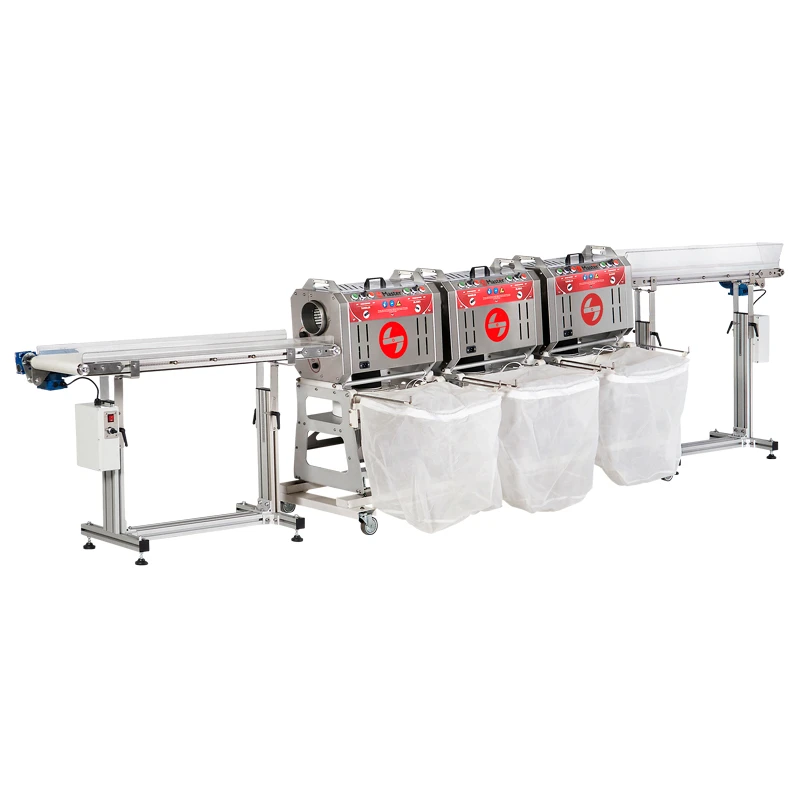 Il trimmer MT200 è in grado di lavorare tra 12 e 14 kg / h, l'equivalente di 10 dipendenti. Se 14 kg / h non ti bastano, ti consigliamo di unire tre delle tue macchine MT Tumbler 200 in tandem.Il sistema completo MT Tumbler 200 è composto da tre macchine MT Tumbler 200, tra cui un binario e nastri trasportatori di ingresso e uscita , un sistema di produzione completo che ti aiuterà a raggiungere una velocità di produzione che può arrivare a 80 kg / h !