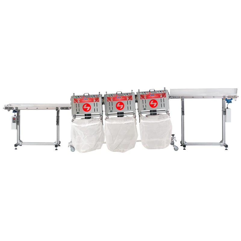 Il sistema completo MT Tumbler 200 è composto da tre macchine MT Tumbler 200, tra cui un binario e nastri trasportatori di ingresso e uscita , un sistema di produzione completo che ti aiuterà a raggiungere una velocità di produzione che può arrivare a 80 kg / h !