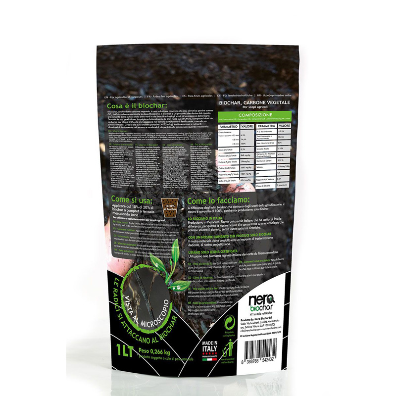 • Applicare dal 10% al 20% di biochar a compost o terriccio mescolando bene.