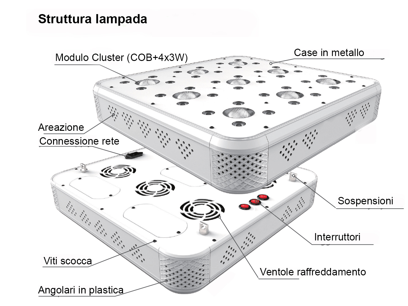Le lampade della serie EVO sono state studiate per lavorare accompagnando le piante nelle varie fasi di crescita e fioritura e sono dotate di interruttori montati sul pannello superiore per settare la colorazione ideale (vegetativa, fioritura, total agro).