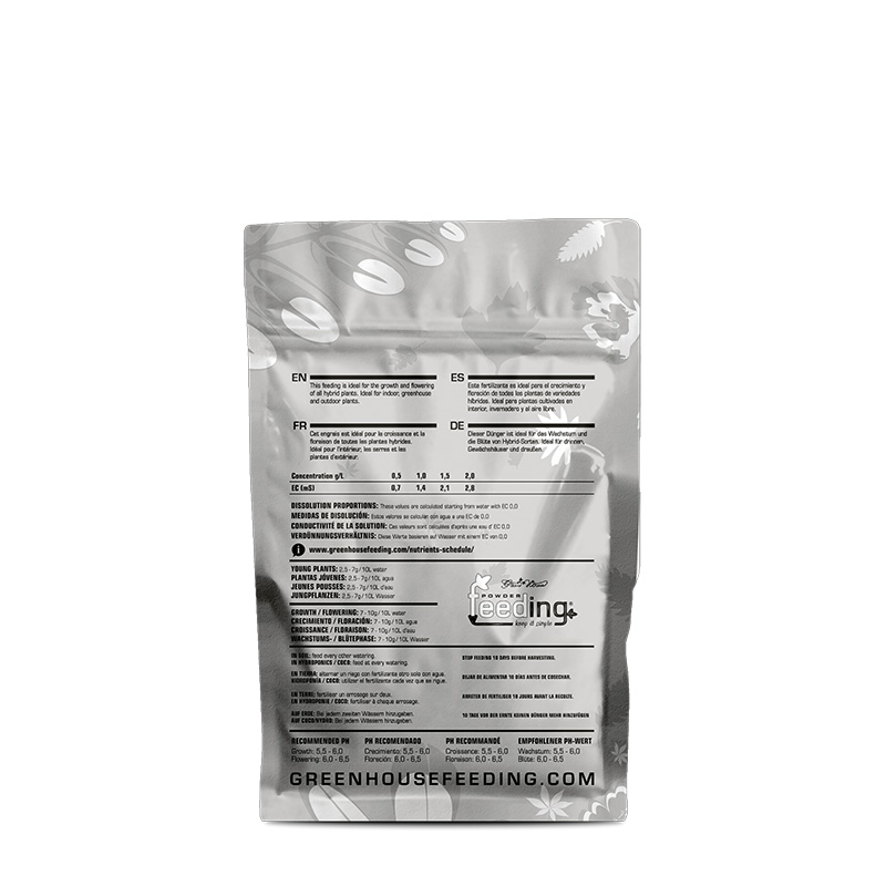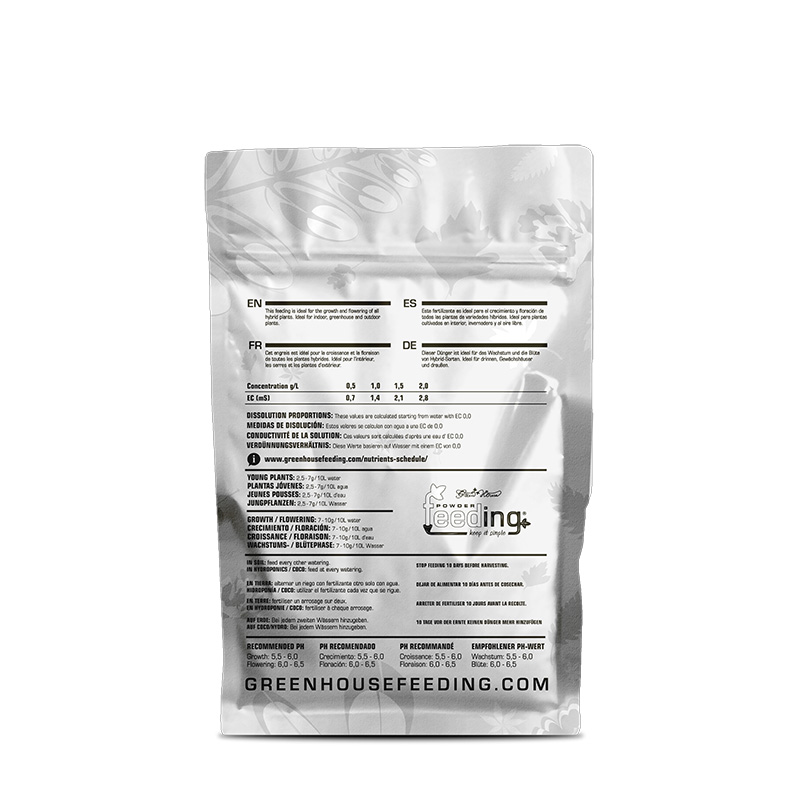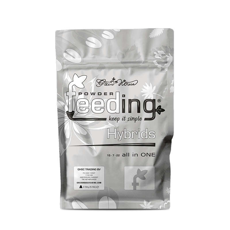 Hybrid feeding contains less ammonia nitrogen and higher amounts of magnesium, which is advantageous for hybrid varieties with a flowering time of 8-10 weeks and plants grown in hydroponic systems. The higher amount of magnesium and sulphate stimulates the production of essential oils, terpenes and flavonoids.