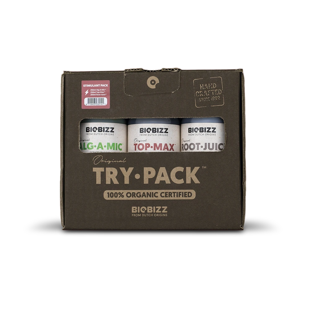 Are your plants grey and lacking vitality? If you have been singing, dancing or talking to them and it is not working, perhaps it is time to try the magic touch of our Try-Pack Stimulant, one of the 4 members of the Biobizz Try-Pack family. So becoming an expert with the Biobizz line of organic fertilisers is really easy.
