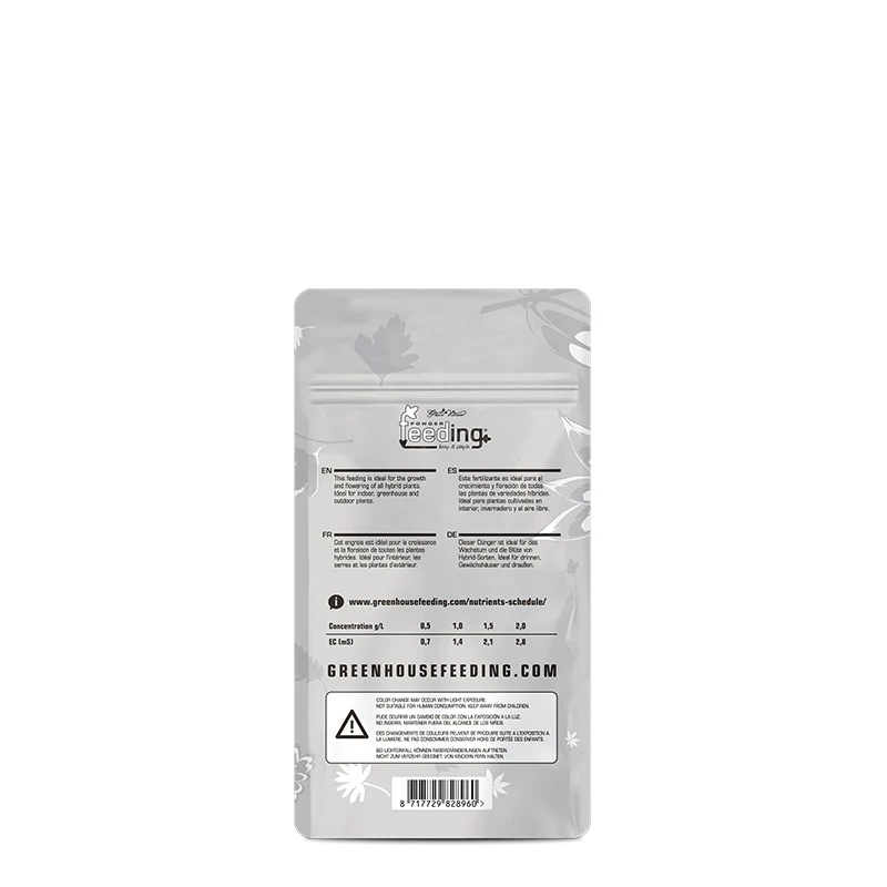 Hybrid feeding contains less ammonia nitrogen and higher amounts of magnesium, which is advantageous for hybrid varieties with a flowering time of 8-10 weeks and plants grown in hydroponic systems. The higher amount of magnesium and sulphate stimulates the production of essential oils, terpenes and flavonoids.
