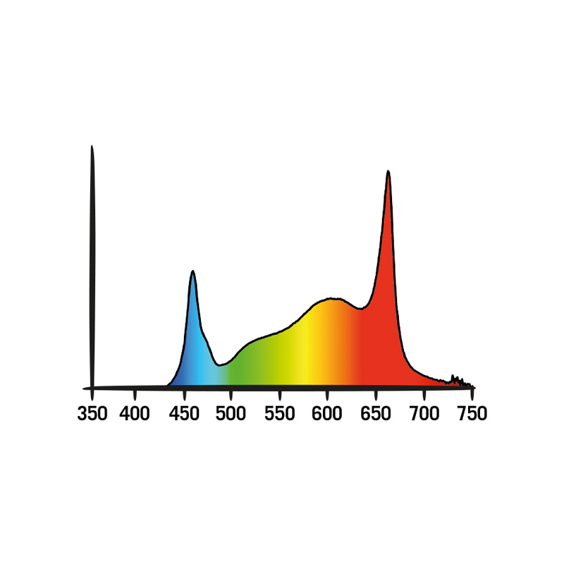 The Cosmorrow LED FS, also called Full Spectrum, is intended for flowering and fruiting due to its red light peak at 660 nm. The blue light peak at 440 nm also makes it compatible with cuttings and growth. We recommend 15 to 35 cm distance from the plants.