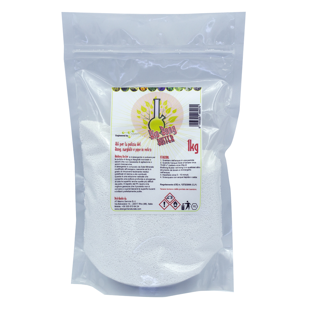 BioBong Buster es el limpiador en polvo para limpiar Bongs y Hookahs incrustados o secos que no requiere agitación ni acción mecánica. El limpiador se compone de sal mineral modificada con oxígeno naciente. Un producto biológico hecho modificando sales naturales de sodio tratadas con ultrasonidos y peróxido de hidrógeno, la sal se "llena" de oxígeno. La sal recién formada es muy estable a temperatura ambiente, pero está preparada para liberar oxígeno por encima de los 60C°. Cuando la sal alcanza los 60 grados (por ejemplo, en agua muy caliente), el oxígeno que contiene sale enérgicamente, creando una reacción de oxidación-reducción contra los depósitos de carbono, los residuos de resina solidificados y el aceite.
