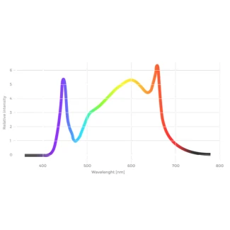 El espectro está diseñado para aplicaciones de interior y está formulado para cubrir el ciclo de vida completo de la planta. Además del azul (430-460nm) y el rojo (630-660nm), el amplio espectro es esencial para la máxima estimulación de importantes pigmentos fotosensibles a diferentes longitudes de onda.
