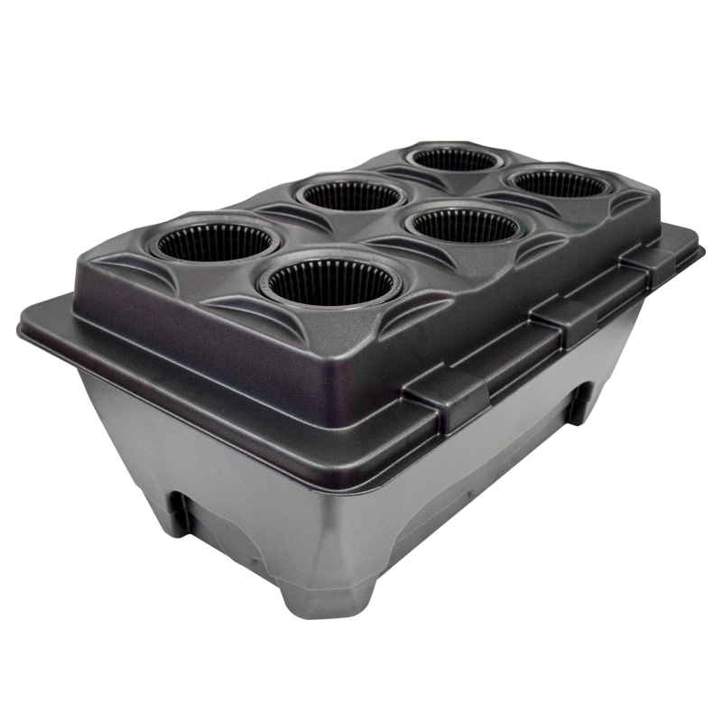 Además, funciona sin temporizador, lo que implica el uso de menos componentes electrónicos que puedan perjudicar su funcionamiento.Las plantas se colocan en guijarros de arcilla situados encima del depósito de agua. Una bomba de aire situada en la parte inferior del depósito inyecta constantemente aire en el agua, lo que aumenta enormemente el contenido de oxígeno. Las raíces crecen a través de macetas de malla en la cámara de pulverización teniendo acceso directo a los nutrientes y al oxígeno, lo que permite un crecimiento muy rápido y rendimientos masivos.