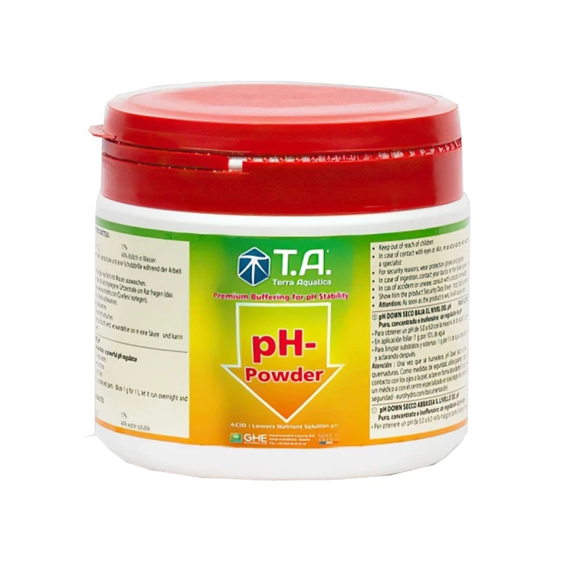 El ajuste del pH es una práctica esencial para todos los cultivadores: hace que los minerales estén disponibles y estabiliza los quelatos, pero para las tiendas que ofrecen venta por correo, el envío de ácidos líquidos puede ser arriesgado, a veces prohibido por las autoridades postales. T.A. pH-Polvo evita estos problemas facilitando y haciendo más seguro el envío.