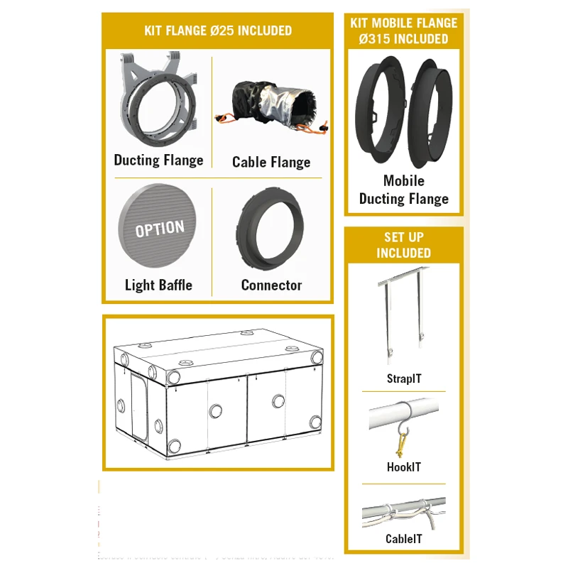 • Accessoires inclus : 2x Paire STRAPITT - Sangles pour filtres 8x Paire HOOKIT - Crochets d'éclairage 60x CABLEIT - Attaches pour câbles et filets 2x POCKETIT - Sac à outils avec hauteur réglable PATCHIT - Pour réparer la tente ou remplacer le DF16.