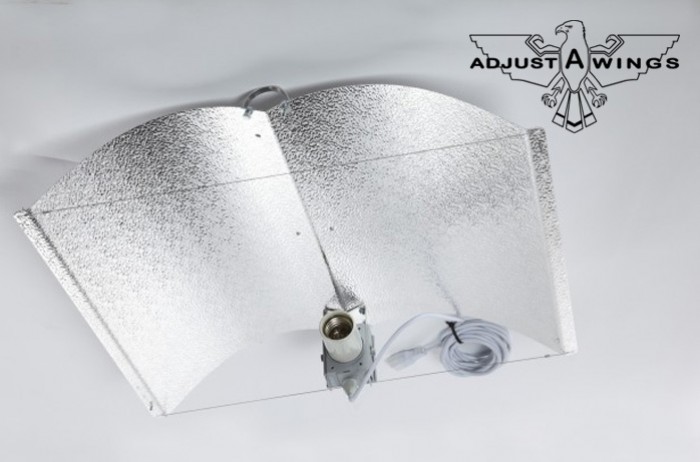 Le système d'ouverture réglable permet d'adapter le faisceau lumineux à l'espace à couvrir en élargissant ou en rétrécissant les ailes grâce à un système de tirants. La forme spéciale des ailes garantit une distribution plus homogène de la lumière et, avec le SUPER SPREADER (EN OPTION ET NON FOURNI), permet d'éliminer les points de chaleur au centre et nous donne la possibilité d'abaisser le réflecteur jusqu'à 20 cm des plantes sans craindre de brûler ou tout simplement de trop réchauffer l'environnement.
