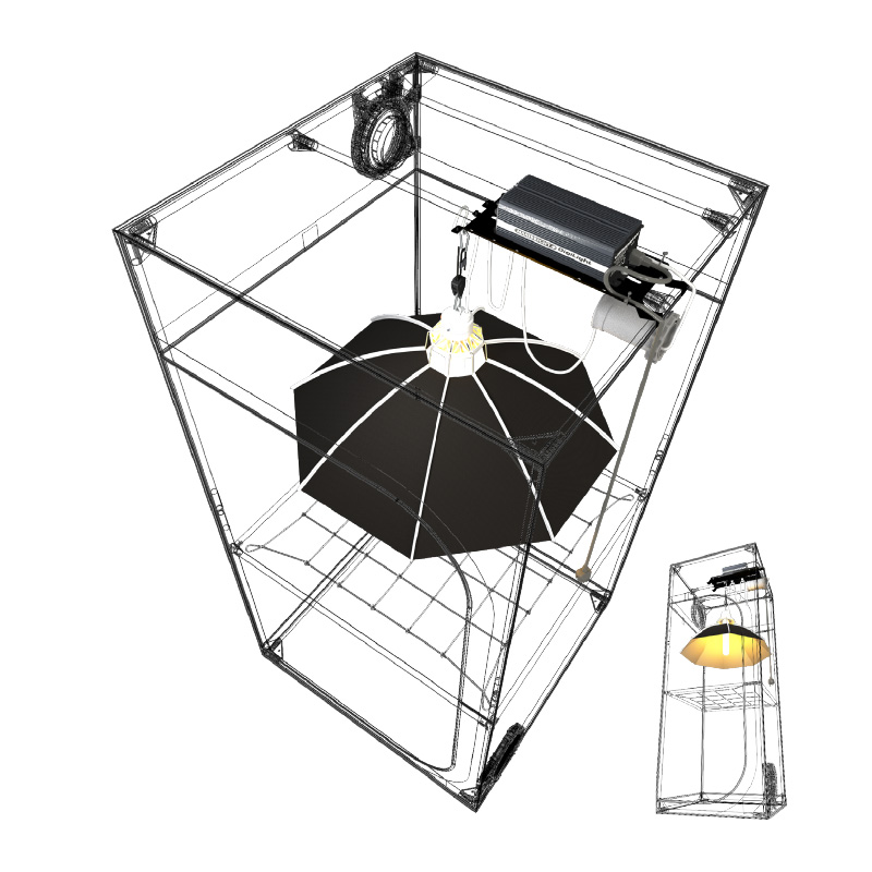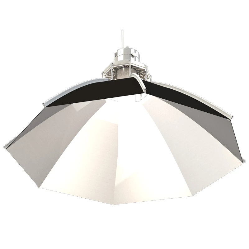La lumière émise par la lampe n'irradie pas directement les plantes mais indirectement, c'est en fait la lumière réfléchie par le grand réflecteur du parapluie, ce qui permet de positionner le réflecteur plus près des cultures sans créer de points de chaleur excessifs.