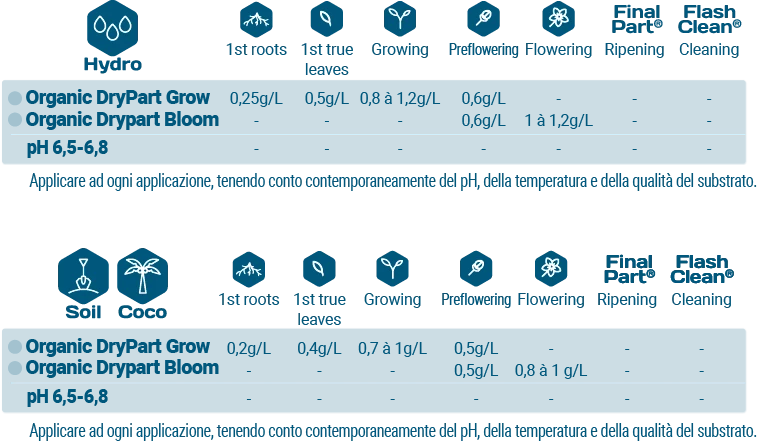 Disponible en deux formules distinctes - Grow pour la croissance végétative et Bloom pour la floraison et la fructification - Organic DryPart® soutient les plantes à chaque étape de leur développement :