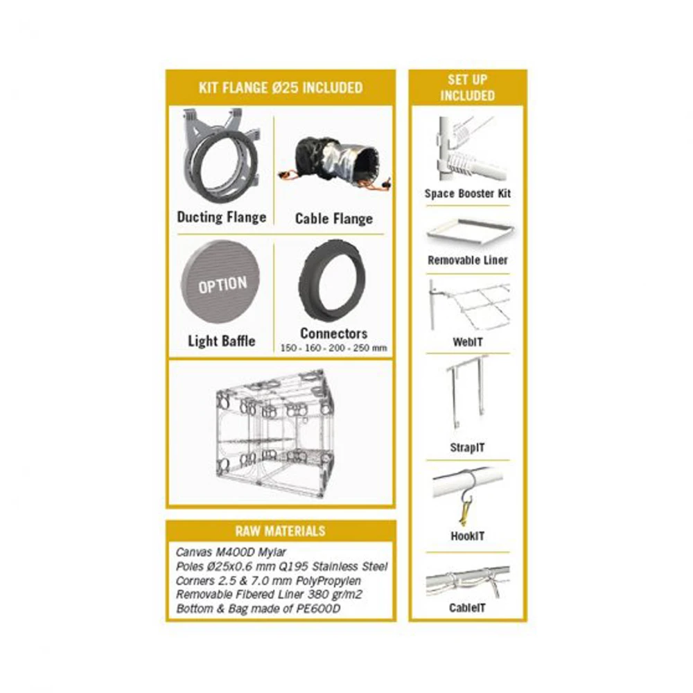 Tutte le Dark Room sono dotate di cerniere a tenuta di luce e possono essere installate rapidamente e facilmente. La Dark RoomDR240W viene fornito con una batteria di accessori gratuiti. Ad esempio, con Dark RoomDR240W, ottieni 2x WebIT120, 1x set StrapIT, 2x set di HookIT, 40x CableIT, 1x PocketIT e Space Booster. Lo Space Booster assicura che le pareti laterali in Mylar non possano più essere aspirate.