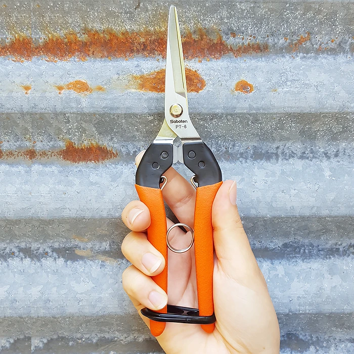 Die in Japan hergestellte Ernteschere SABOTEN ist robust und gut verarbeitet. Die Klingen aus hochwertigem japanischem Karbonstahl sind hartverchromt und extra glatt poliert, damit die Pflanzen beim Schneiden nicht zerkratzt oder gerissen werden. Dieses Modell ist mit 48 mm langen Klingen ausgestattet. Es handelt sich um eine robuste Schere mit soliden Leistungsmerkmalen und langer Lebensdauer.