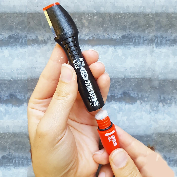 L'aiguiseur SABOTEN est doté d'un petit bloc en carbure de tungstène à une extrémité pour l'affûtage et d'un applicateur en éponge à la base de l'appareil pour conditionner et huiler les lames.